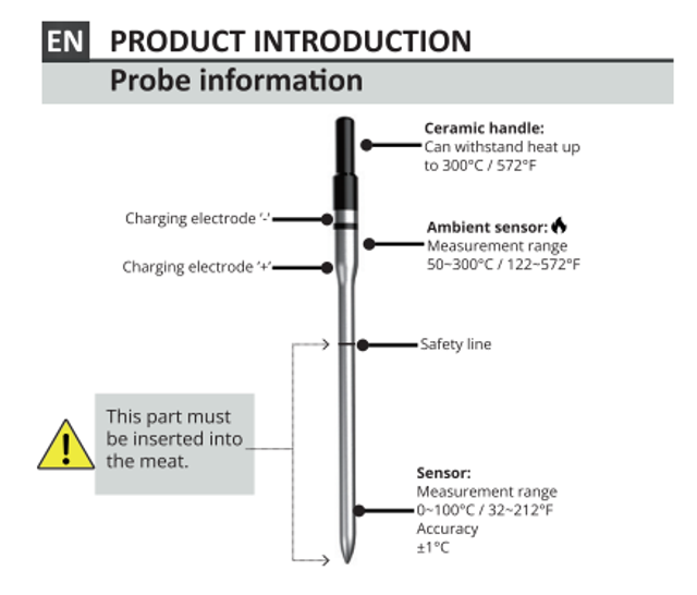 På själva sonden finns en säkerhetslinje som visar hur långt proben ska sättas in i köttet. Du kan titta närmare på hur den ska sättas in här: